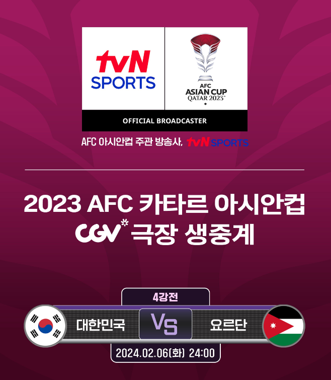 아시안컵 4강 요르단전을 극장에서 대형 스크린으로 즐길 수 있습니다. 매진되기 전에 서둘러 예매하세요.